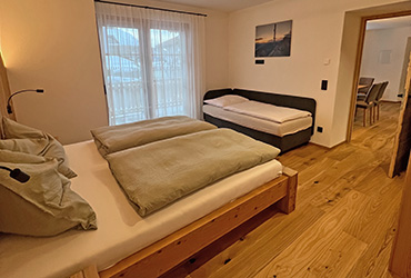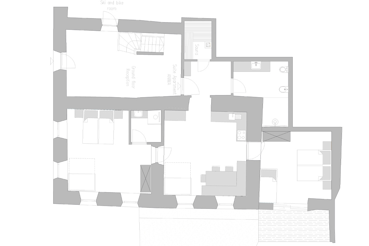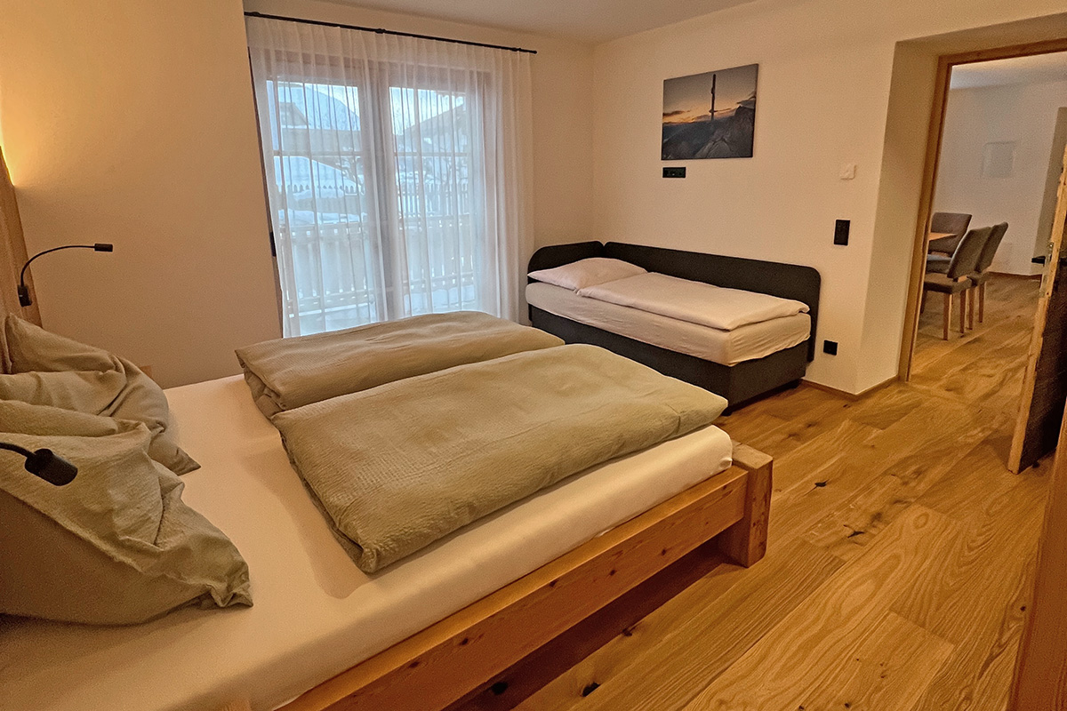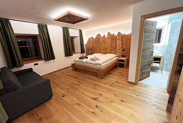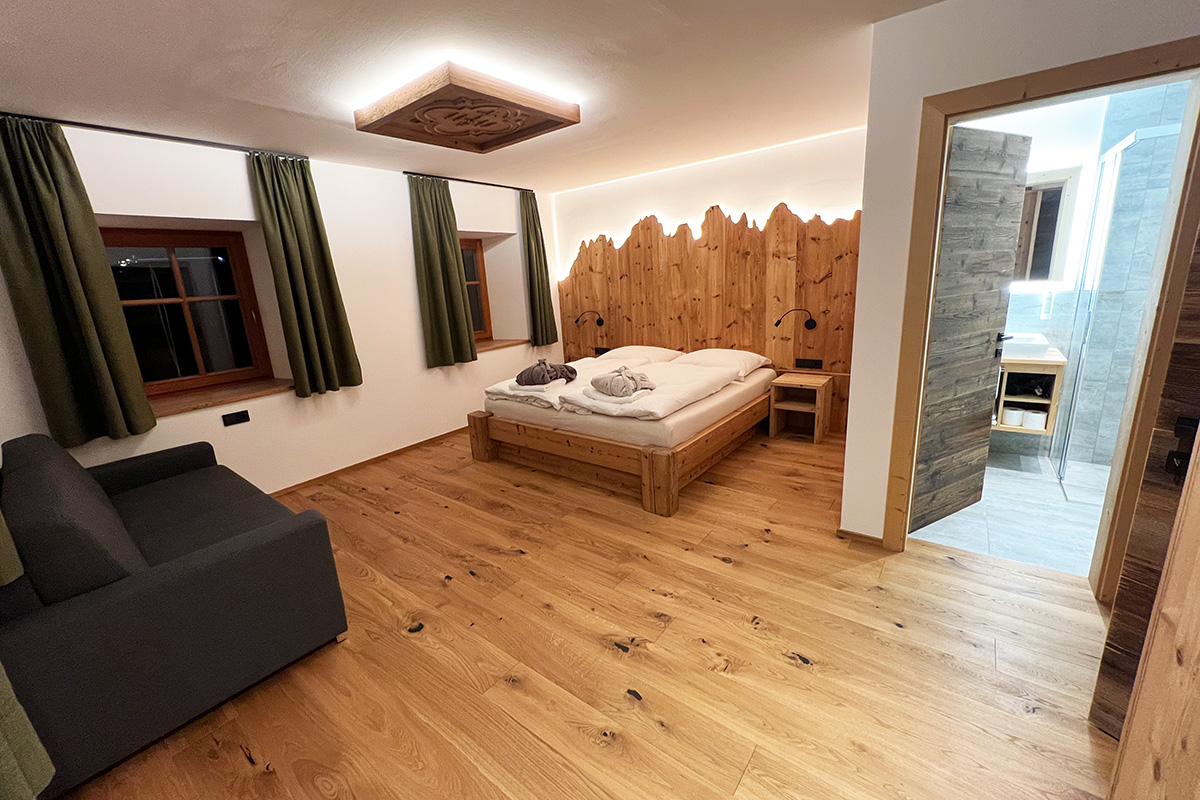 Con il Suite Apartment ANIMA, questa atmosfera rivive: Due accoglienti camere da letto con rivestimenti in legno ricavati dalla stube storica, una spaziosa cucina-soggiorno e due eleganti bagni offrono comfort moderno in un ambiente autentico.
