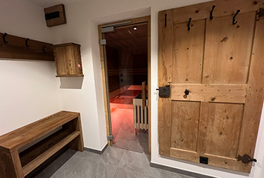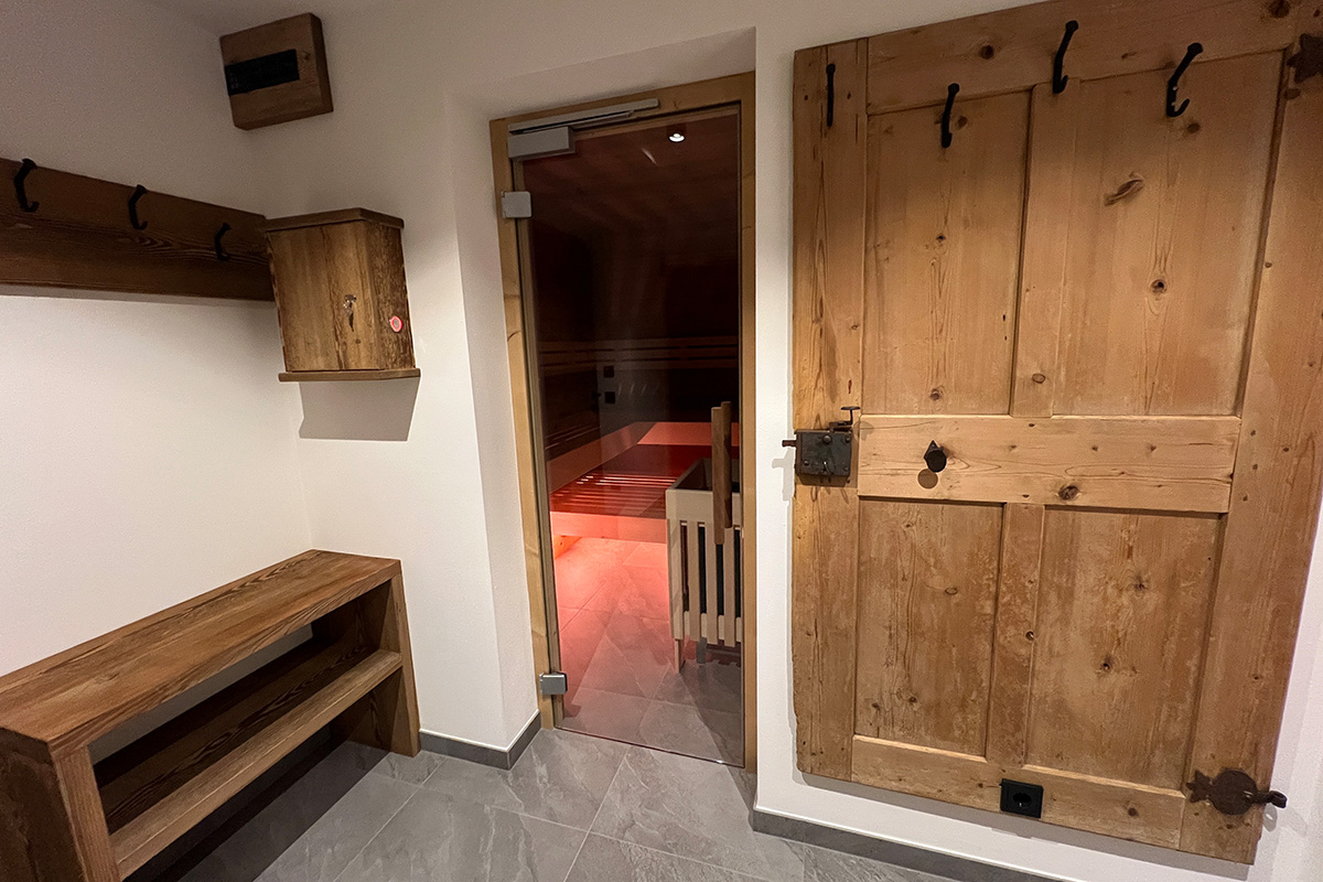 Un vero fiore all’occhiello è la sauna finlandese – realizzata con il legno originale della vecchia stube. Là dove un tempo batteva il cuore caldo della casa, oggi ci si può rilassare e rigenerare – in un ambiente ricco di carattere e storia.